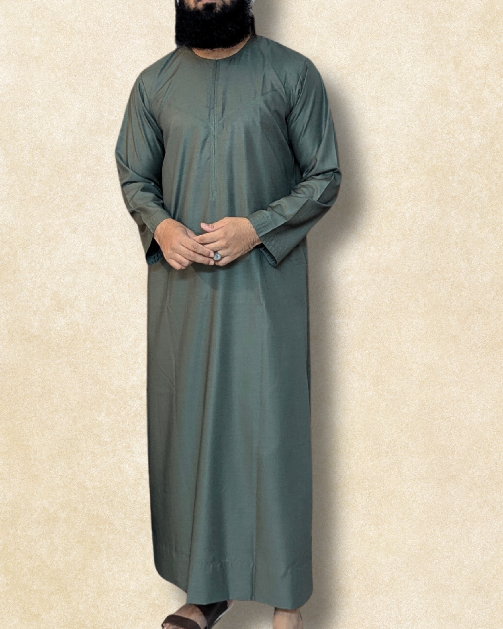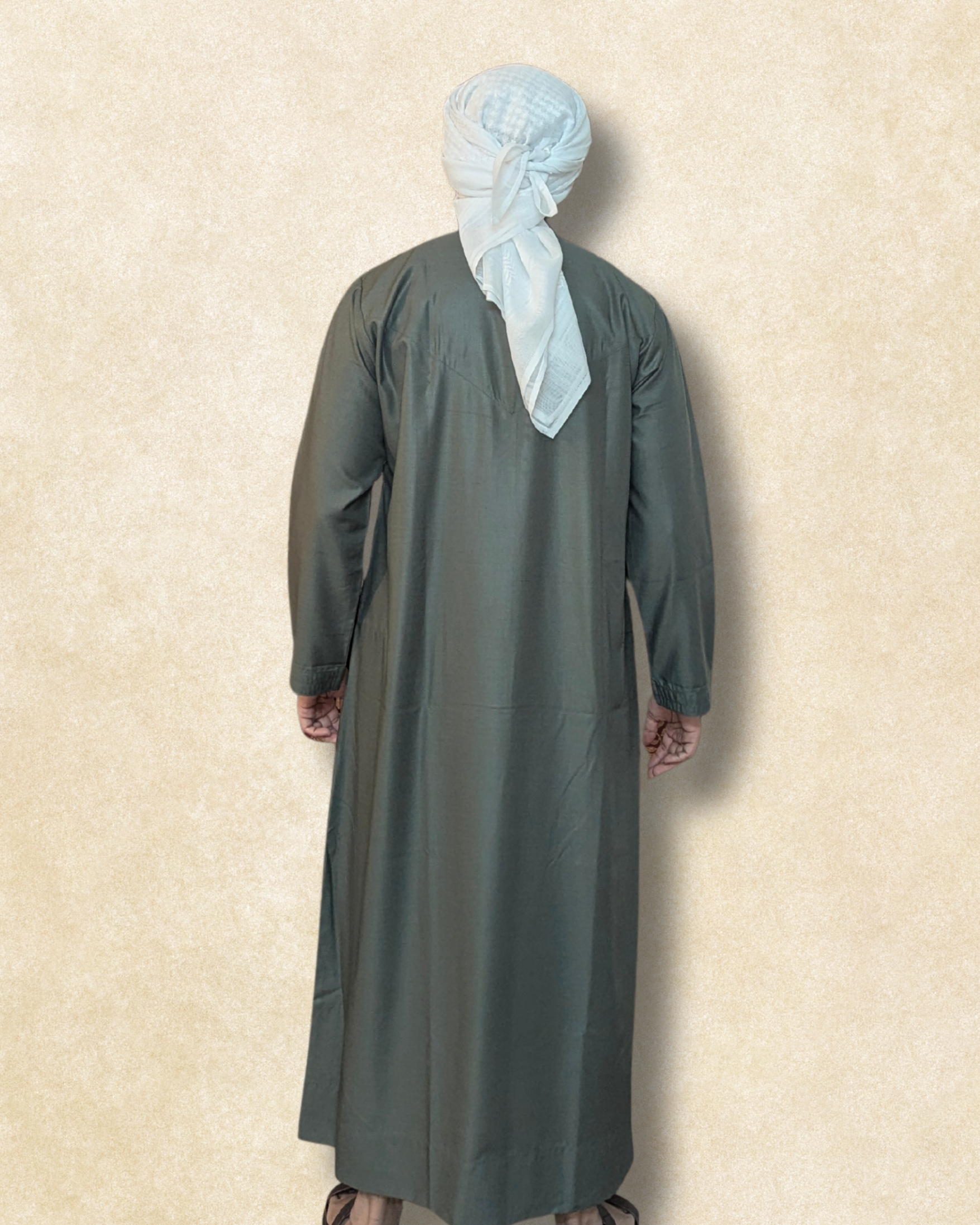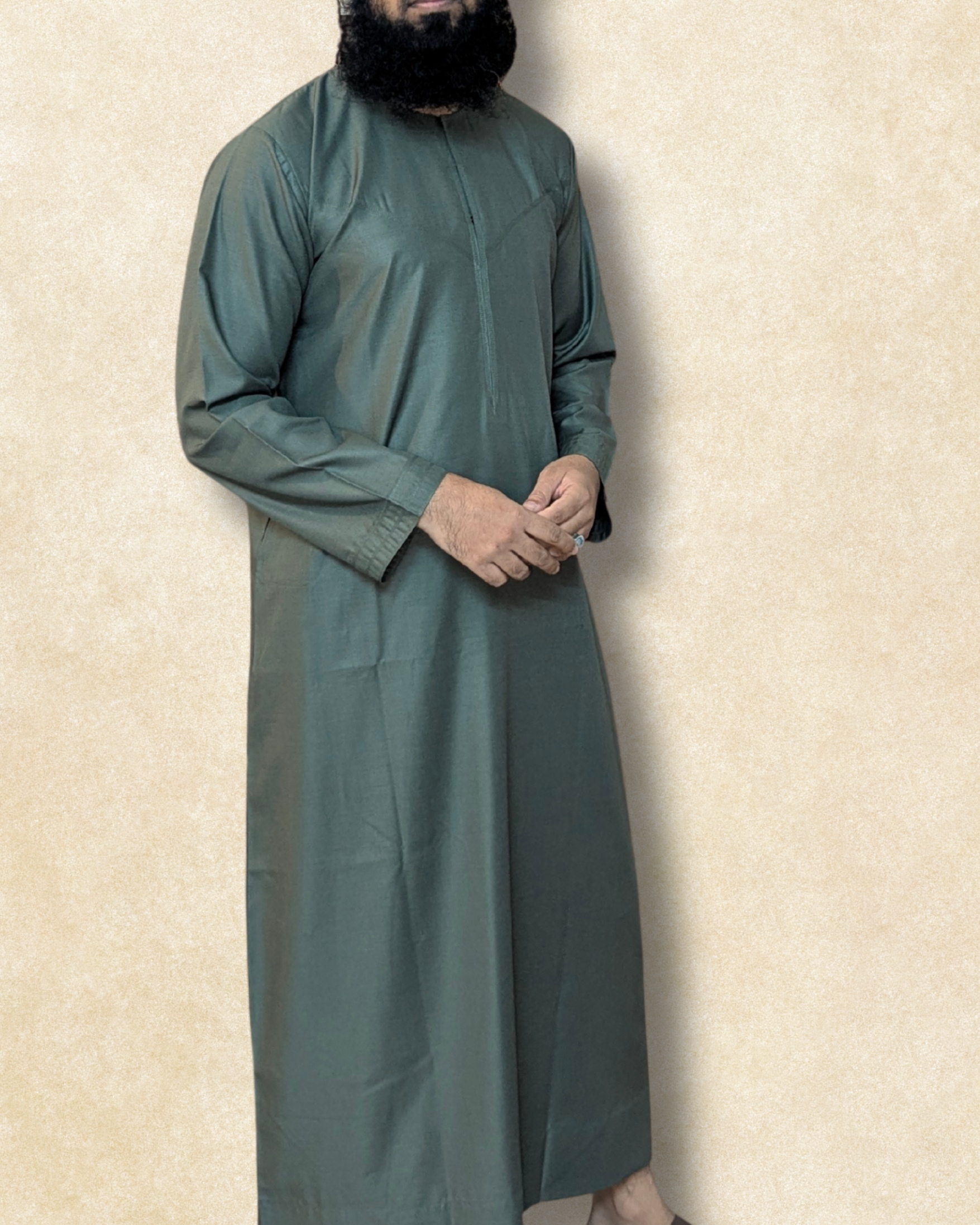 Understated yet distinctive, the By Naheek Emirati Thobe in Olive Green is crafted for men who appreciate subtle luxury and refined comfort.